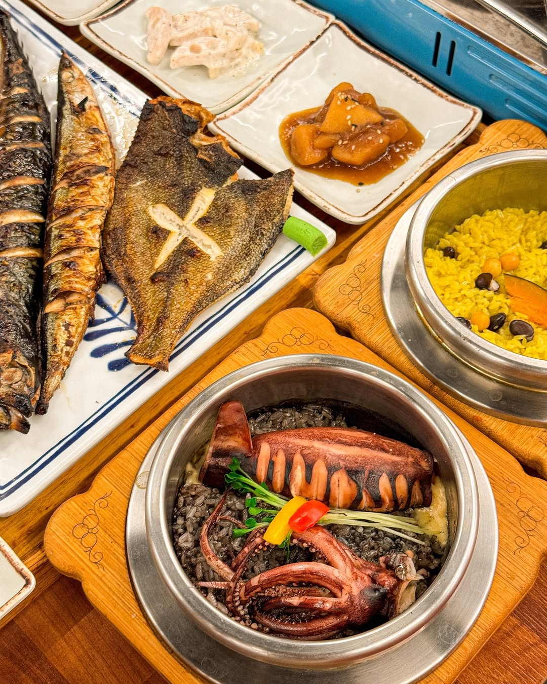 특히나 오징어 먹물 솥밥은 비주얼부터 압도적! 🦑 통통한 오징어가 듬뿍 들어가 있고, 짭짤 고소한 먹물밥과 버터, 치즈가 어우러져 입안 가득 황홀함을 선사하죠. 밥만 먹어도 꿀맛인데, 여기에 윤기 자르르 흐르는 화덕 생선구이까지 곁들이면… 이거야말로 밥도둑이 따로 없어요! 😭🔥